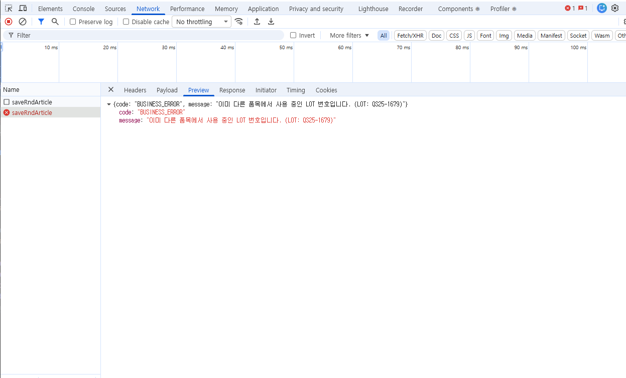 실제로 프론트엔드에서 뿌려지는 문구를 확인해보자. 저장 버튼 클릭시 번호가 중복되면은 문구를 띄워줬다.