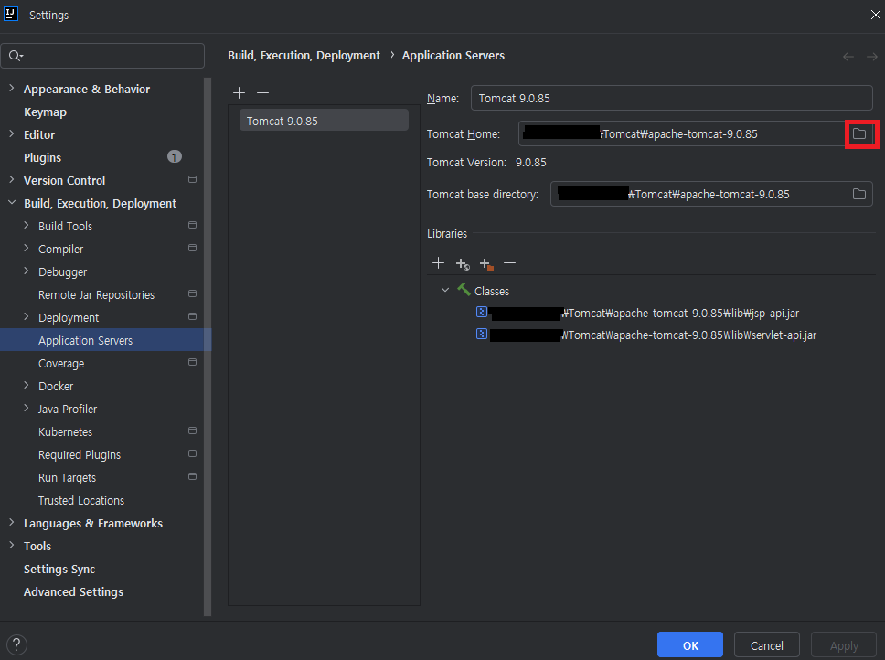 5. IntelliJ Tomcat 연동 : File > Settings > Build, Execution, Deployment > Application Servers > + 버튼을 클릭하고 'Tomcat Server'를 선택하여 Tomcat 서버를 추가한다. Tomcat Home 및 Tomcat base directory를 %TOMCAT_HOME% 경로로 지정한다.