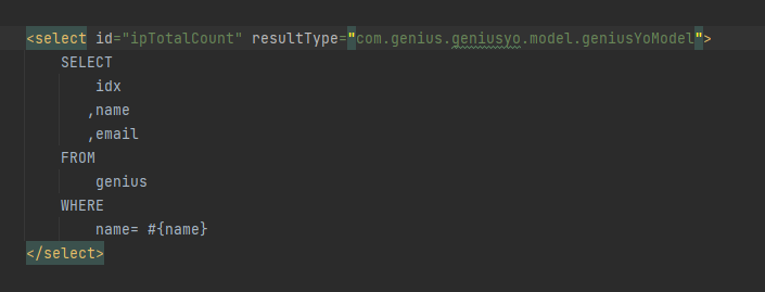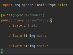 .xml 에서 TypeAlias를 지정하지 않으면 com.genius.geniusyo.model.모델명 과 같이 패키지명을 포함한 클래스명을 입력해야 하지만 @Alias를 사용하면 다음과 같이 사용할 수 있습니다.