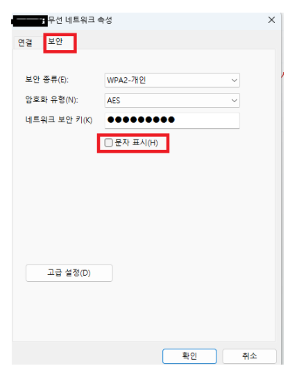 5. 사용 중인 무선 네트워크 우클릭 → "상태" → "무선 속성" -> "보안" 탭 → "문자 표시" 체크하면 비밀번호 확인