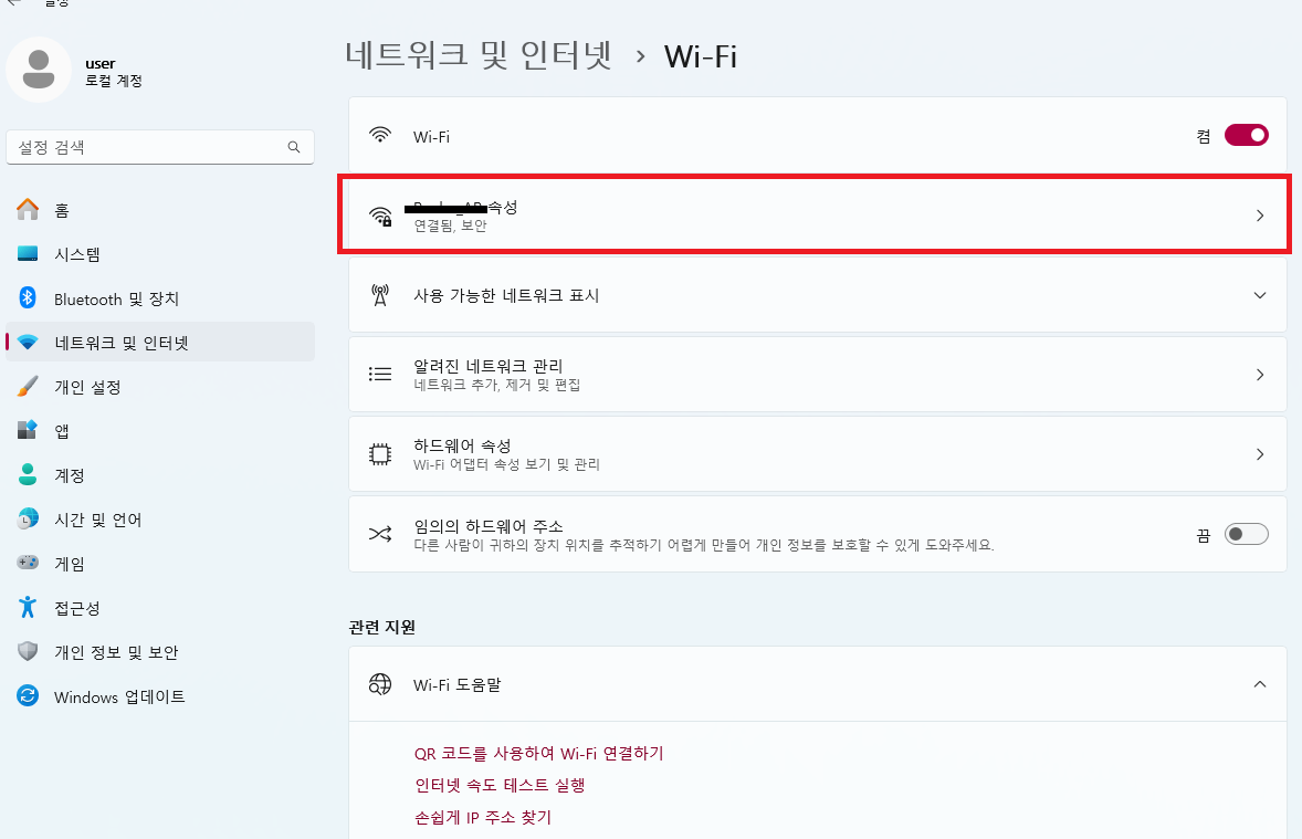 3. 현재 연결되어있는 Wi-Fi 속성 클릭