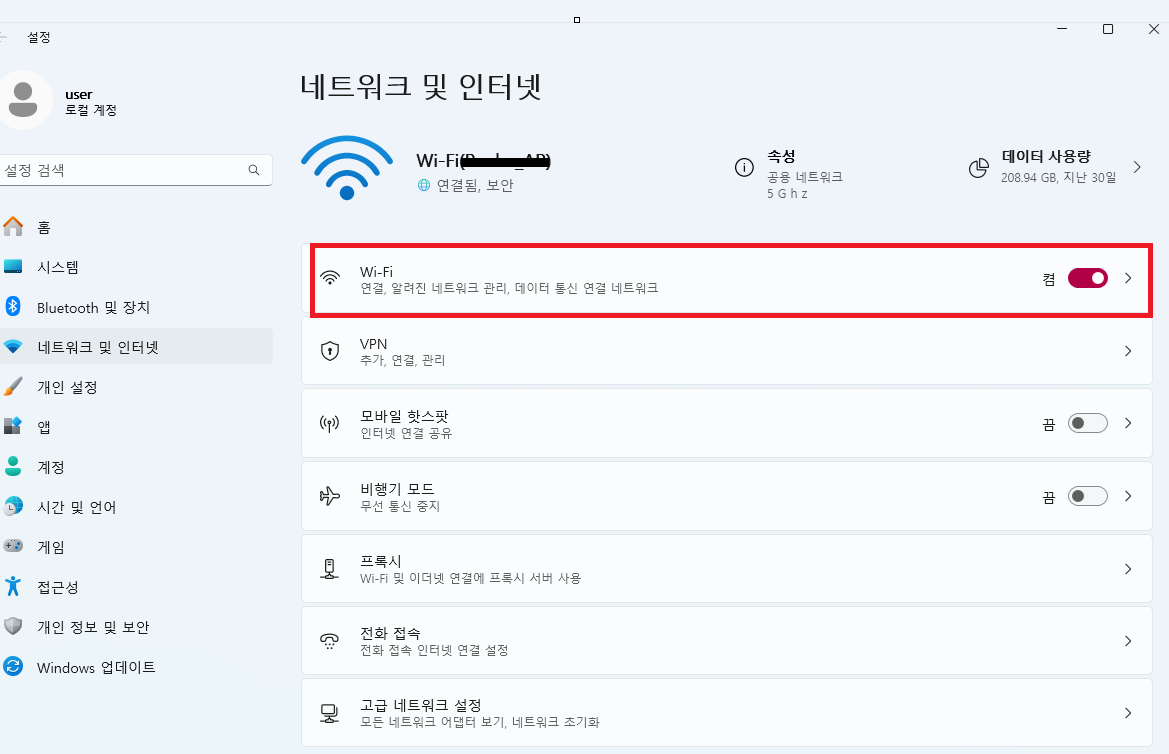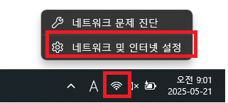 1. 작업표시줄 → 와이파이 아이콘 우클릭 → "네트워크 및 인터넷 설정"