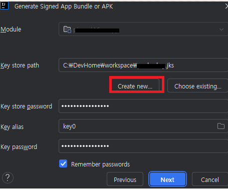 3. 처음 만드는경우 Create New... 버튼을 클릭한다. jks파일을 만들어야한다 .