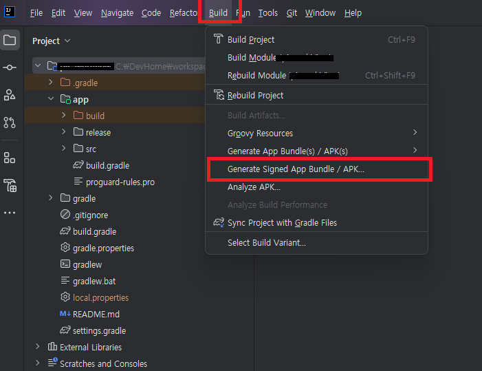 1. Build -> Generate Signed App Bundle /APK ... 클릭을한다.
