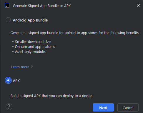 2. 이후 APK 라디오버튼 클릭 후 Next