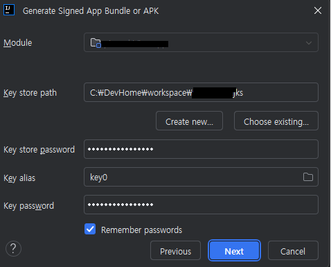 4. key store path에 폴더를 클릭 후 .jks파일을 저장할 폴더를 지정해준다 이후
