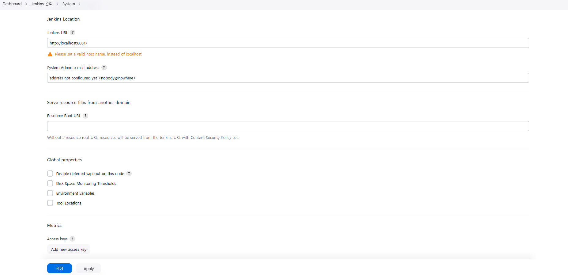 3.Jenkins Location -> Jenkins URL-> https://aaa.ako.co.kr/으로 변경 (변경전 후 이미지 첨부 ) -> 저장버튼 클릭