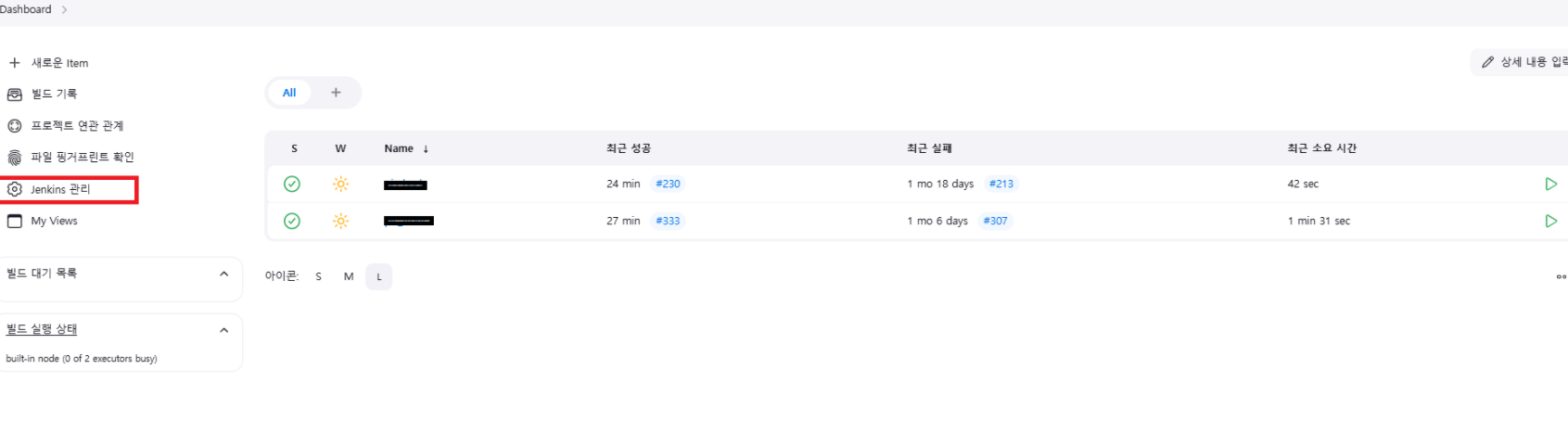 2.Jenkins 설정 (url 접속) -> Jenkins 관리 클릭