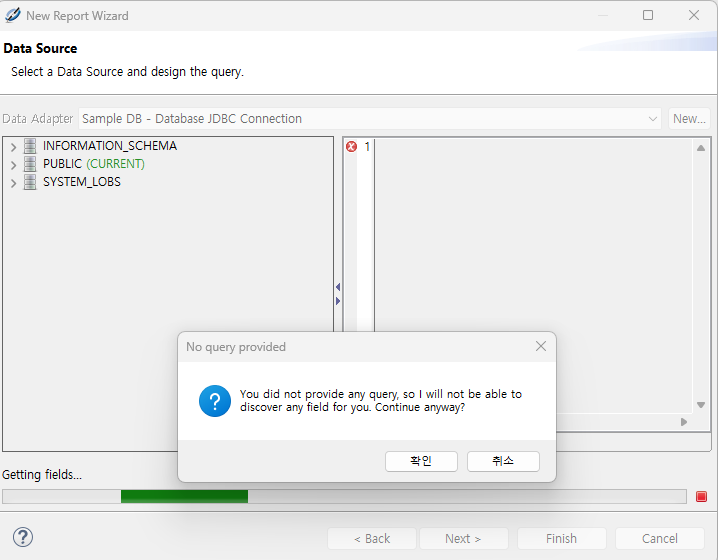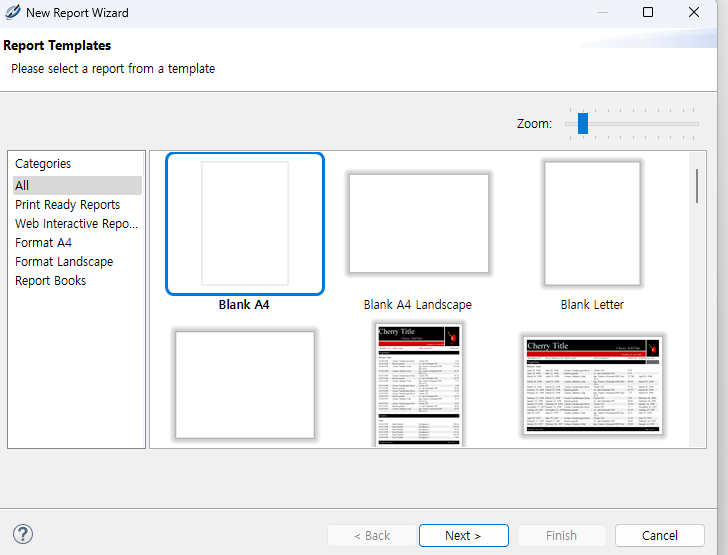 5. Templet (Blank A4) 클릭 -> File Name 설정 (TestReport.jrxml)-> Sample DB ( 제스퍼 제공 샘플 데이터베이스) 클릭 -> 확인 클릭 -> Finish