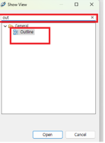 7. 만약에 outline이 안보인다면은 window -> show view -> other 클릭 -> out 입력 후 더블클릭