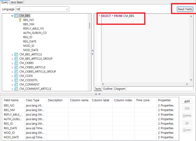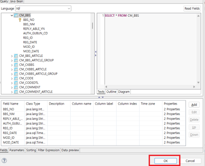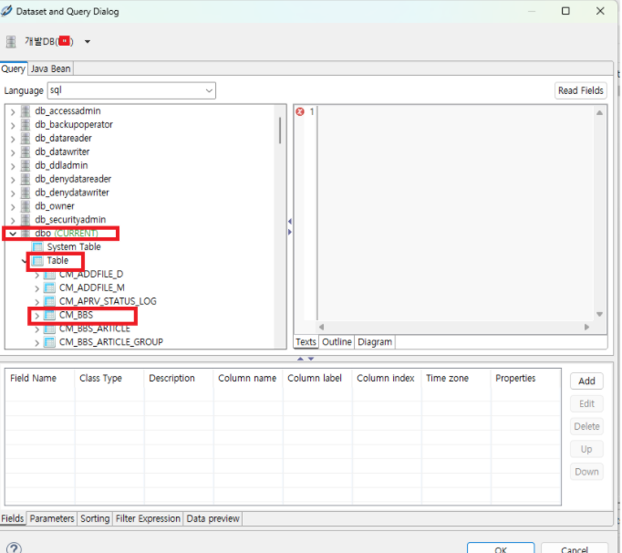 5. 해당 이미지 클릭 후 연결 할 DB 선택 -> 이후 Table 클릭 후 -> SELECT 문 입력 이후 Read Fileds 클릭 -> 이후 OK 버튼 클릭