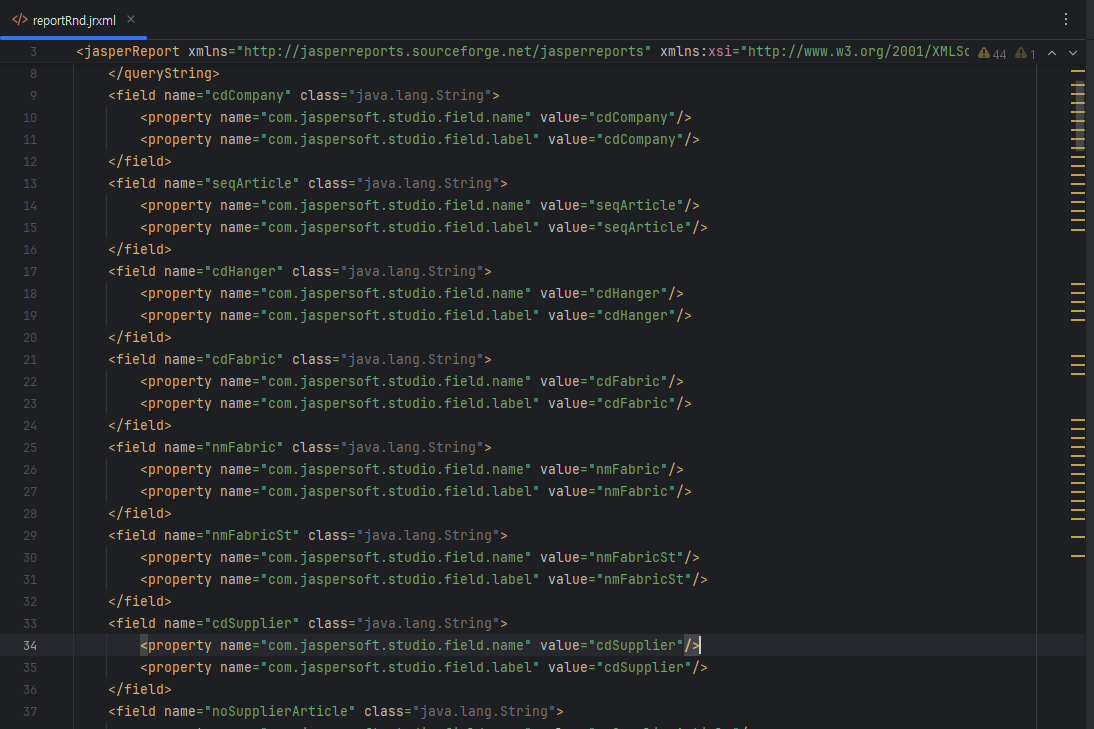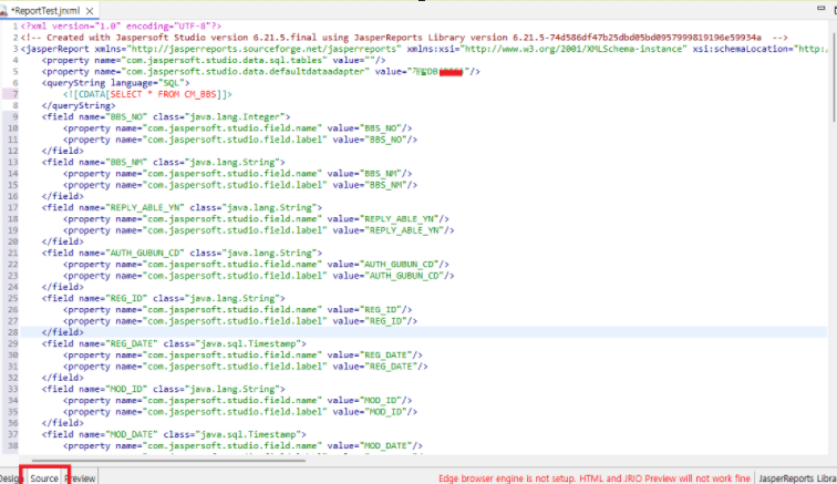 4. Jasper Report 에서 만든 파일 -> source로 이동 후 복사 -> 이후 jxrml파일에 붙여넣기 -> 이떄 Value값이 DTO에 값이 된다. 그러므로 카멜케이스형식으로 value값을 변경해줘야한다 !!!
