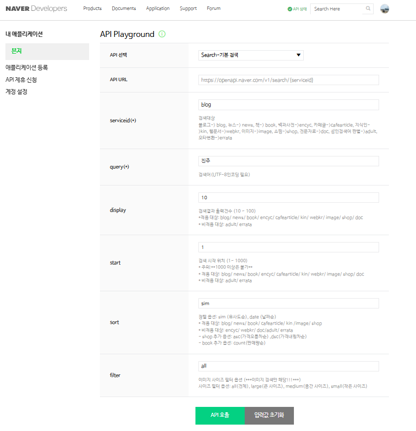 4. API선택에서 search- 기본 검색 클릭 후 API 호출