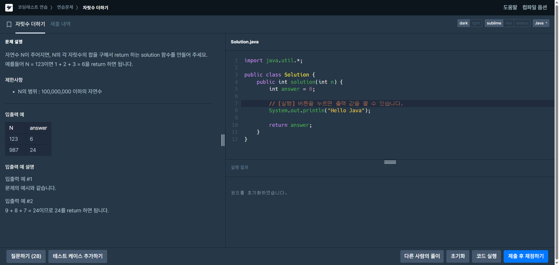 N의 값은 문자열을 더한 1+2+3 = 123 숫자를 더한 1+2+3 =6 이렇게 예시가 나온다. 먼저 숫자를 문자열로 변환을 해야한다. for문 while문 등 여러 방법이 있지만 내 스타일로 해봤다.